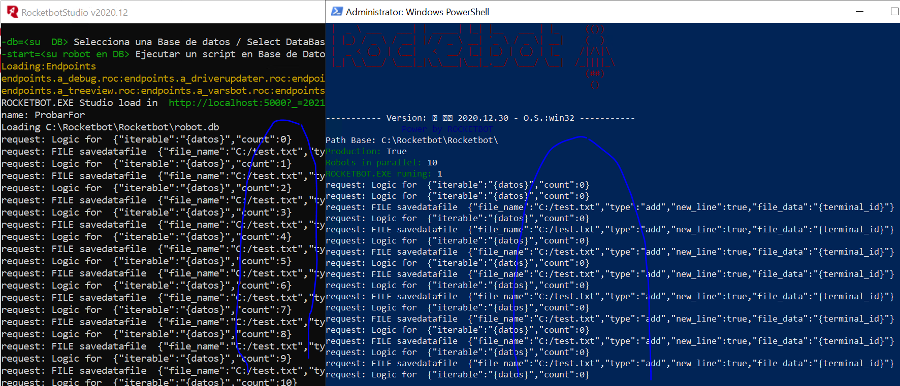 Estimado, hice otra prueba con un robot super simple para probar el ciclo for, uno a través de Studio y el otro corriendo desde rocketbot.exe, en la imagen se aprecia la diferencia que se produce en el count de la variable, además este es el código json del robot simple que probé, favor ayuda. JSONRead more
