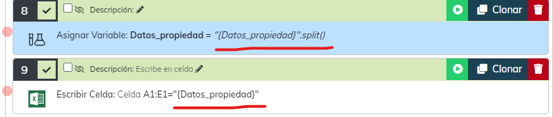 Daniel, en un Asignar Variable realice un “{Datos_propiedad}”.split(” “). y luego con Escribir celda haga lo siguiente: