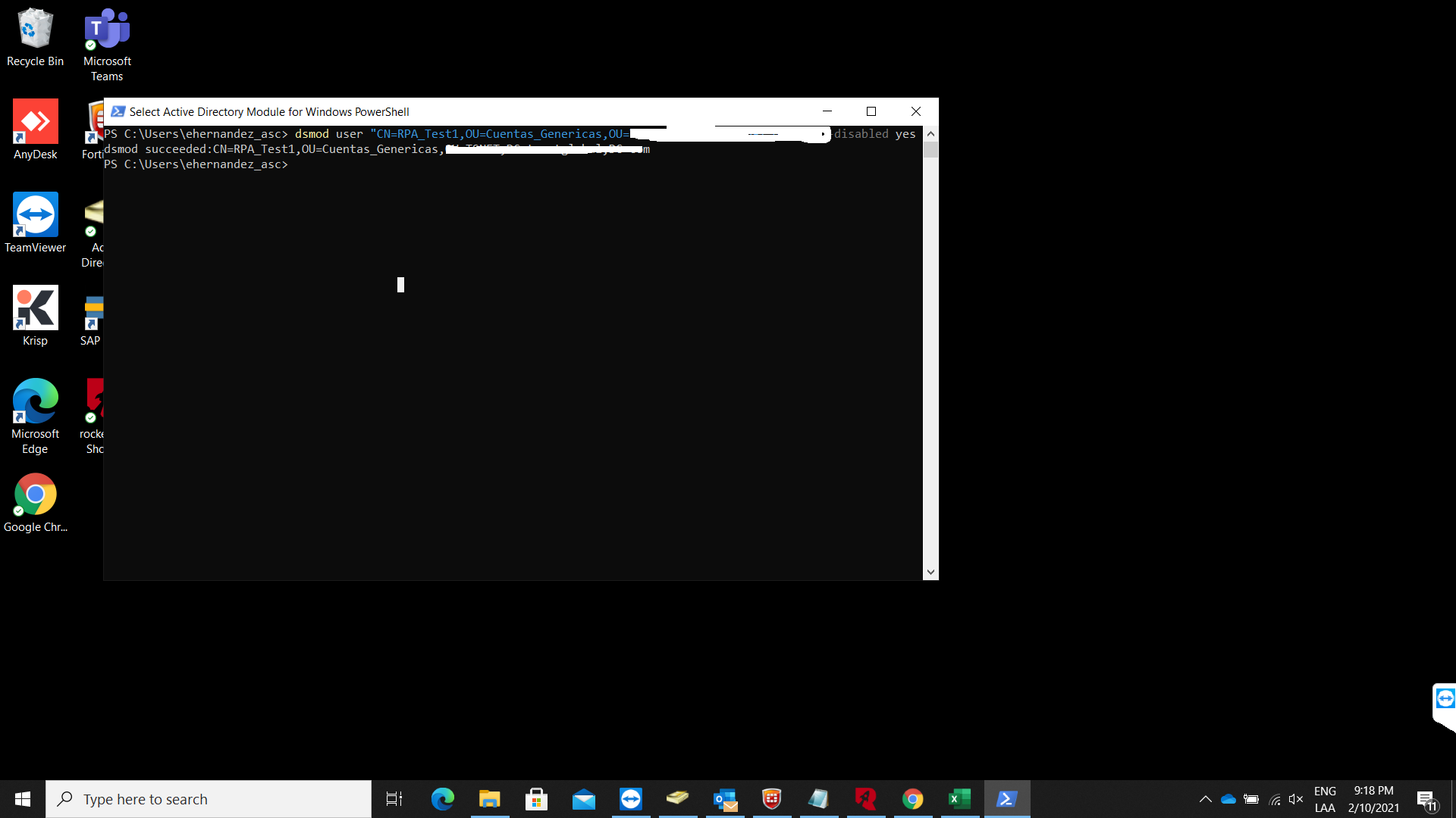 Hola Bender, gracias por responder, te comento que si funciono todo , el detalle es que la variable solo toma la primera linea, deberia de tomar las 2 lineas es decir el comando y el resultado. Solo toma el comando es decir : dsmod user "CN=RPA_Test1,OU=Cuentas_Genericas,OU=My,DC=domain,DC=com" -diRead more