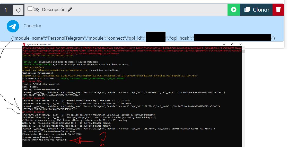 0 Gerardo Asked: Mayo 4, 2022In: Módulos PersonalTelegram ERROR con actividad Conectar 0 Hola, un favor su apoyo, estoy tratando de utilizar la actividad Conectar del módulo PersonalTelegram, seguí todos los pasos de la documentación pero no menciona nada de que me llegará un código y que debo ingresarlo por consola. Por favor ... personaltelegramquestion