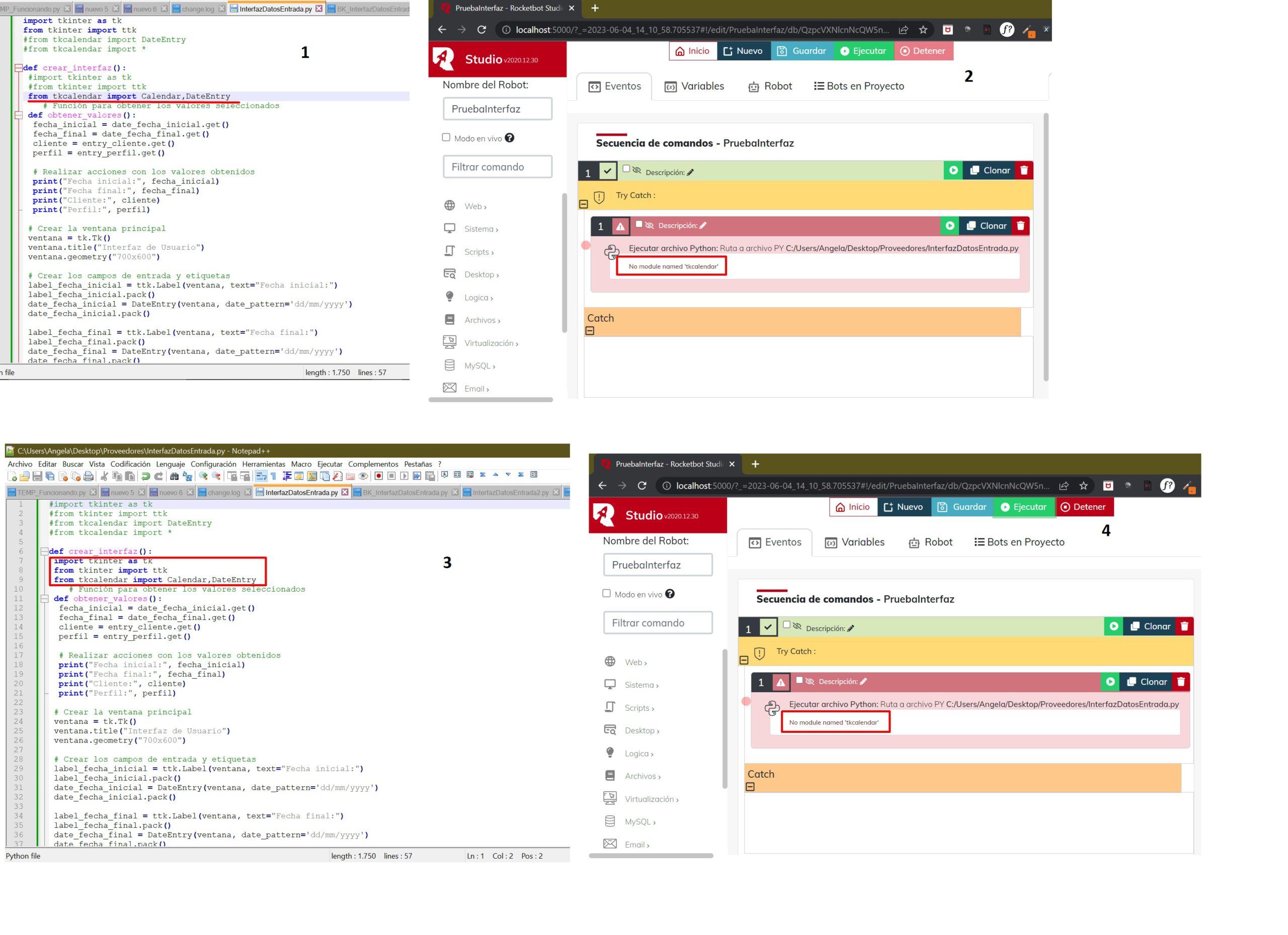 Hola! WALL -E Gracias por responder. Hice lo que me indicaste, pero aún sigue el error :( ¿Qué estoy haciendo mal? Adjunto imagen PruebaLibreria.jpg. También pegaré aquí el código para ver si me puedes ayudar :( Código: #import tkinter as tk #from tkinter import ttk #from tkcalendar import DateEntryRead more