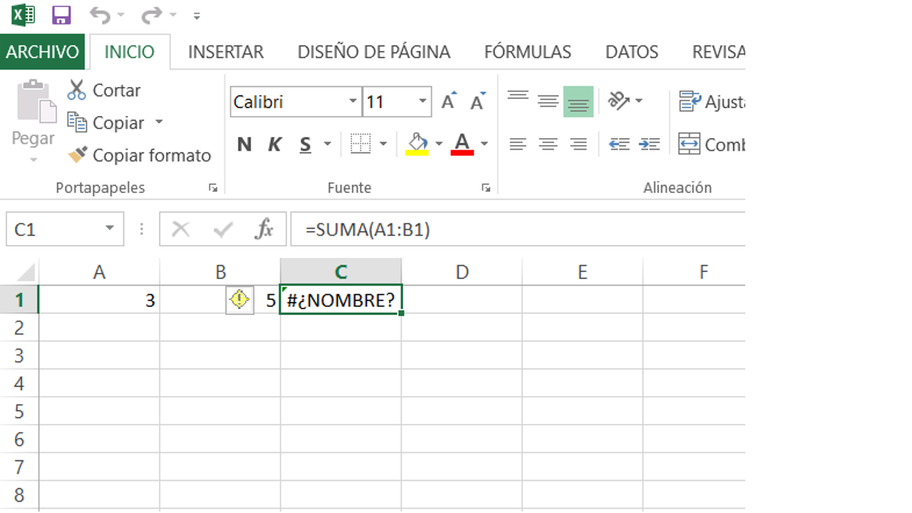 =SUMA(A1:B1) al entrar al libro en la celda de la fórmula de muestre #¿NOMBRE?