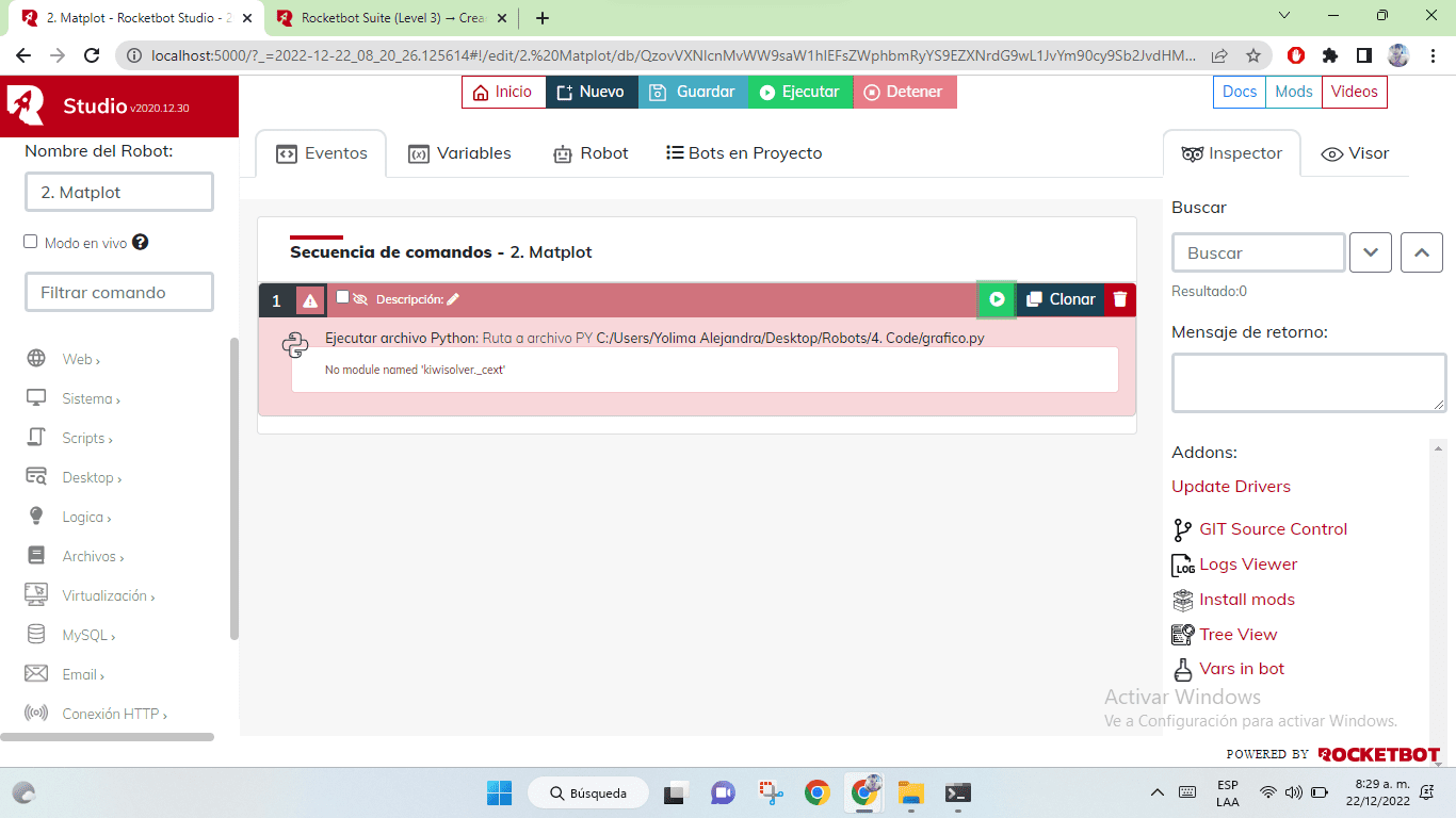 Hola, espero pronta solución Al instalar la versión indicada de python Python 3.6.8 de 32 bits y continuar instalando la librería obtengo el siguiente mensaje. ¿Cómo puedo solucionar? C:\Rocketbot_20201230_a4_win\Rocketbot\modules\libs>pip install matplotlib -t . “pip” no se reconoce como un comando ...