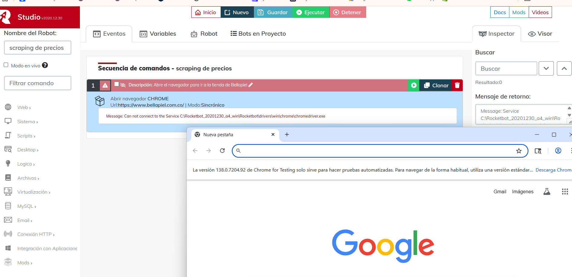 Estoy tratando de abrir el navegador chrome con una URL, pero abre el navegador pero no la pagina de la URL. Ya realice la actualización chromedriver según las instrucciones y pegue el contenido en la carpeta: Rocketbot\drivers\win\chrome incluso el aplicativo que ...
