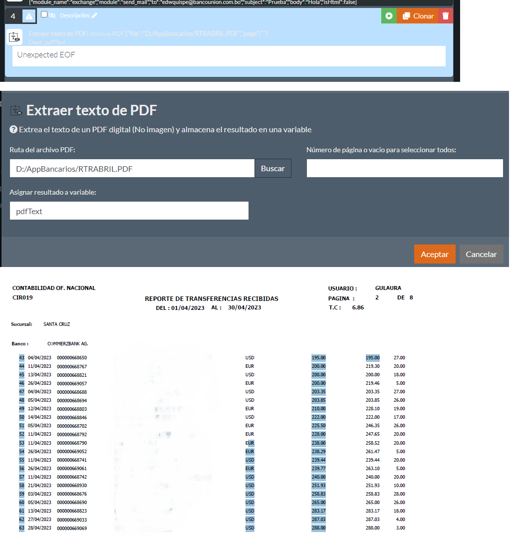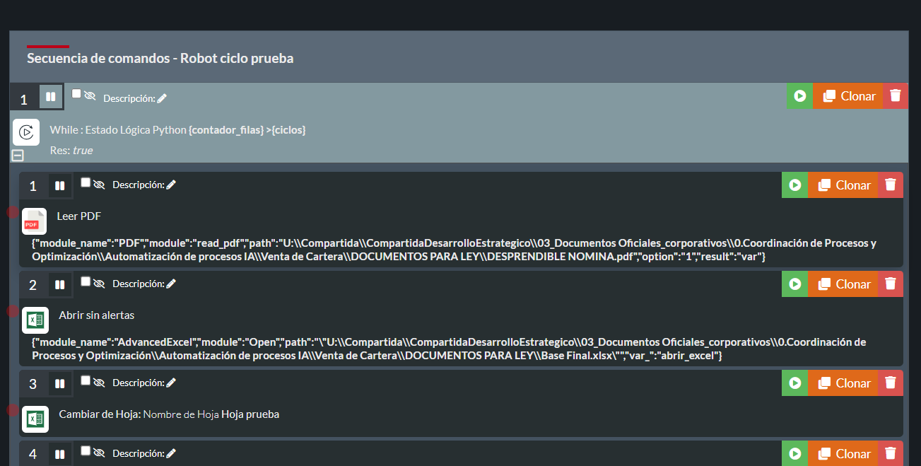 Buenos díasSoy noato en rocketbot, necesitaria guardar datos de varois pdf en un excel, consigo leeer corerctamente los pdf , però no consigo saber como leer varios de ellos y guardar todo en un excel. hay aglun robot de ejemplo ...