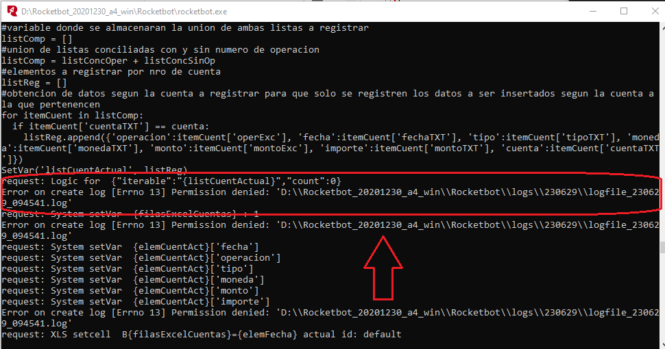Que tal amigos, tengo una duda cuando estoy ejecutando mis robot que se van desarrollando en todos me da el error de: ‘Permission denied: ‘D:\\Rocketbot_20201230_a4_win\\Rocketbot\\logs\\230629\\logfile_230629_094541.log’ Por favor una ayuda para que si llegue a tener permisos, tomar en cuenta que ya se ...
