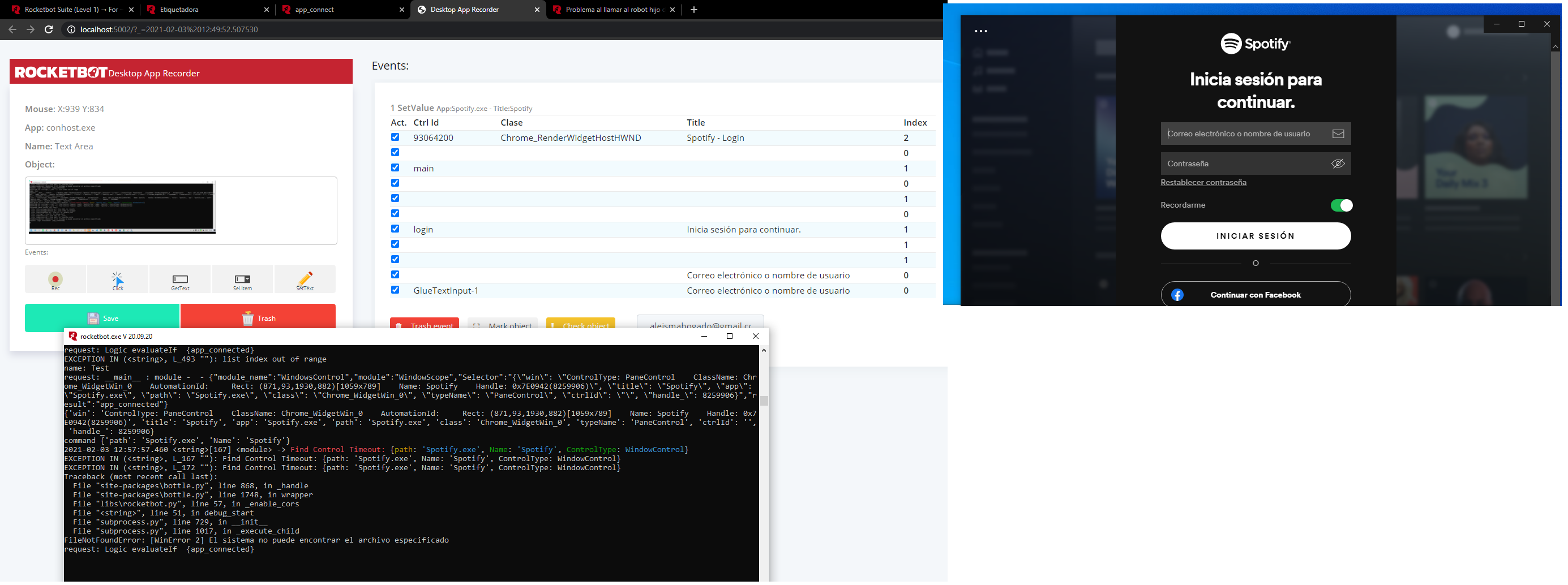 Hola gente, nose si les paso pero estoy teniendo problemas con Rocketbot Desktop Recoder no logra identificar pantallas y elementos. Estoy con la app de Spotify