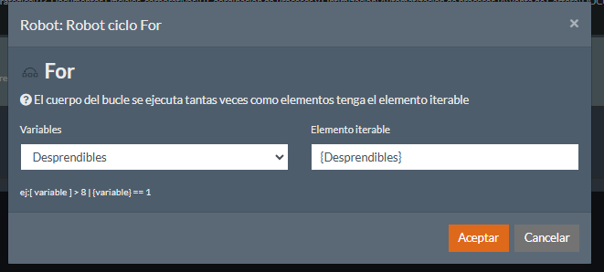 Primero tenes que ejecutar el comando “Listar archivos ordenados” y esa variable que guarda el resultado es la que vas a poner en Elemento iterable. Luego vas a crear otra variable que es la que vas a seleccionar en el la lista que aparece.