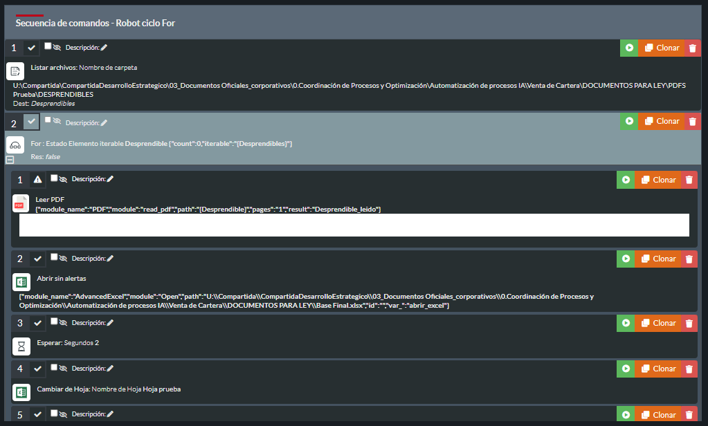 Gracias por al ayuda, si me sirvió el ciclo, me lee los PDF de la carpeta y repite el proceso la misma cantidad que # de PDFs hay, pero el problema es que la acción “Leer PDF” no me esta leyendo el PDF, este es el error: “[Errno 2] No such file or directory: ‘POSITIVA COMPAÑIA DE SEGUROS.pdf'”.