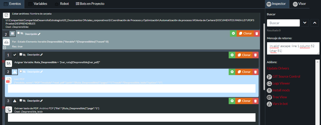 Pero me sigue apareciendo el error en la acción “Leer PDF”: “Invalid \escape: line 1 column 52 (char 51)”, Ya con la ruta “bien”.