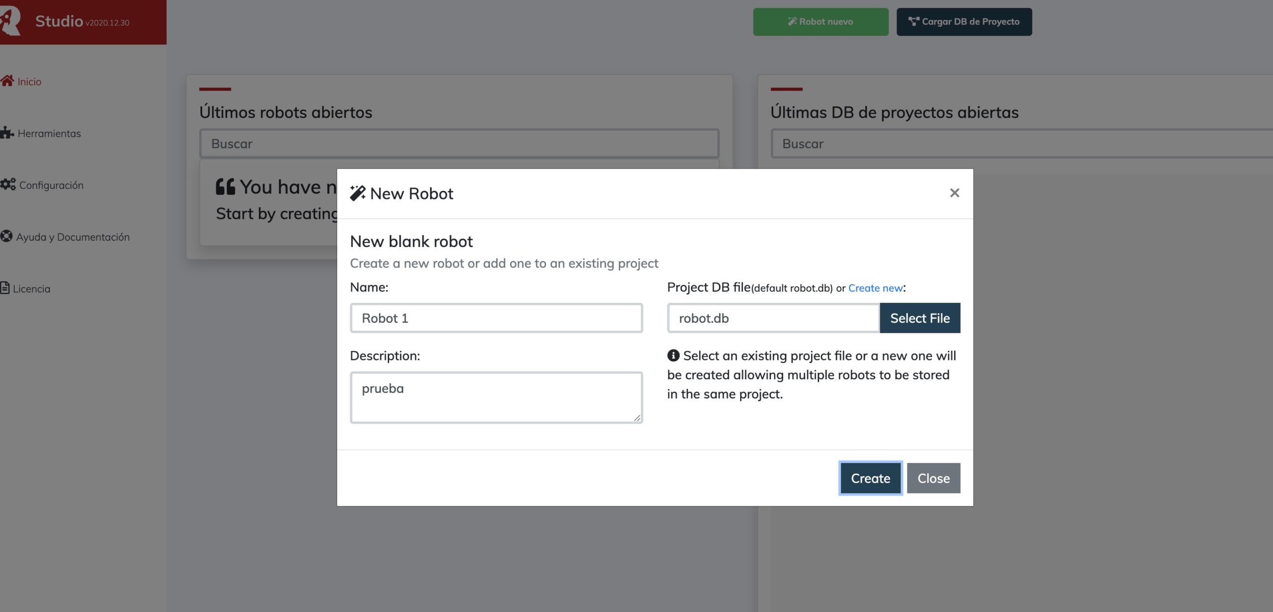 hola, logre instalar el SW, pero no me deja crear un robot de prueba.