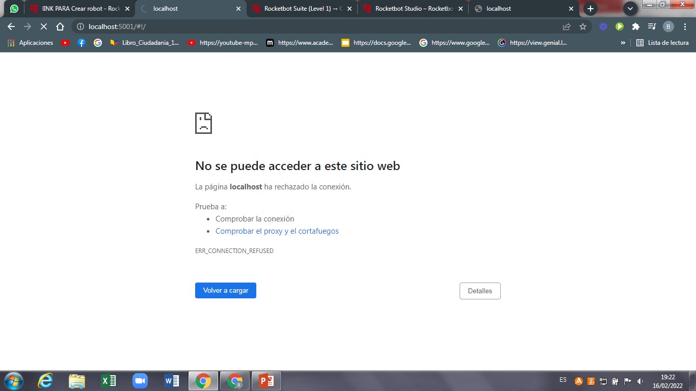 Hola. Por algun motivo luego de ejecutar el aplicativo rocketbot no carga la página http://localhost:5000/#!/ y no puedo poner en práctica el curso. Ya lo he realizado con el navegador de Chrome.