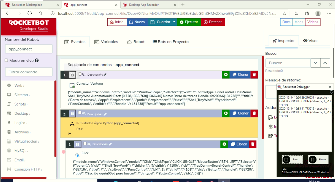 Sin embargo, ahí mismo construí un robot simple (Desktop Recording) que solo haga un clic para maximizar una aplicación que ya está abierta. Este lo importé en el Rocketbot Studio pero en este caso no funcionó.
